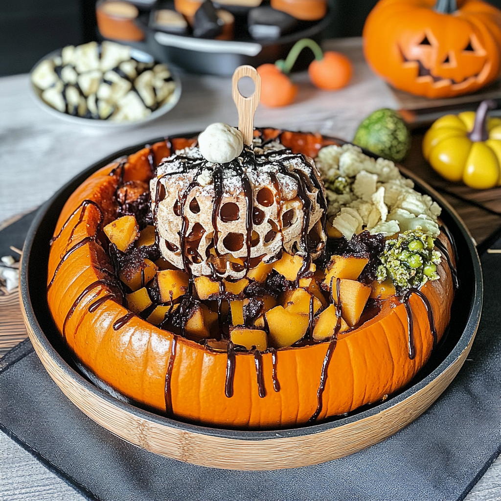 Pumpkin Spice Punch: A festive blend of pumpkin puree, apple cider, and spices served in a cauldron-style bowl adds a touch of whimsy.