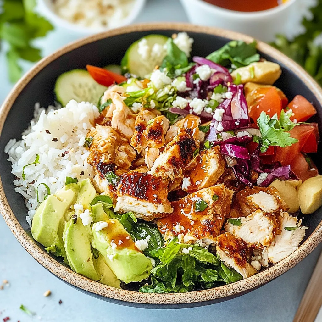 - Assemble Your Bowl: In serving bowls, layer your grain base first followed by grilled chicken strips topped with fresh vegetables and a sprinkle of cilantro.