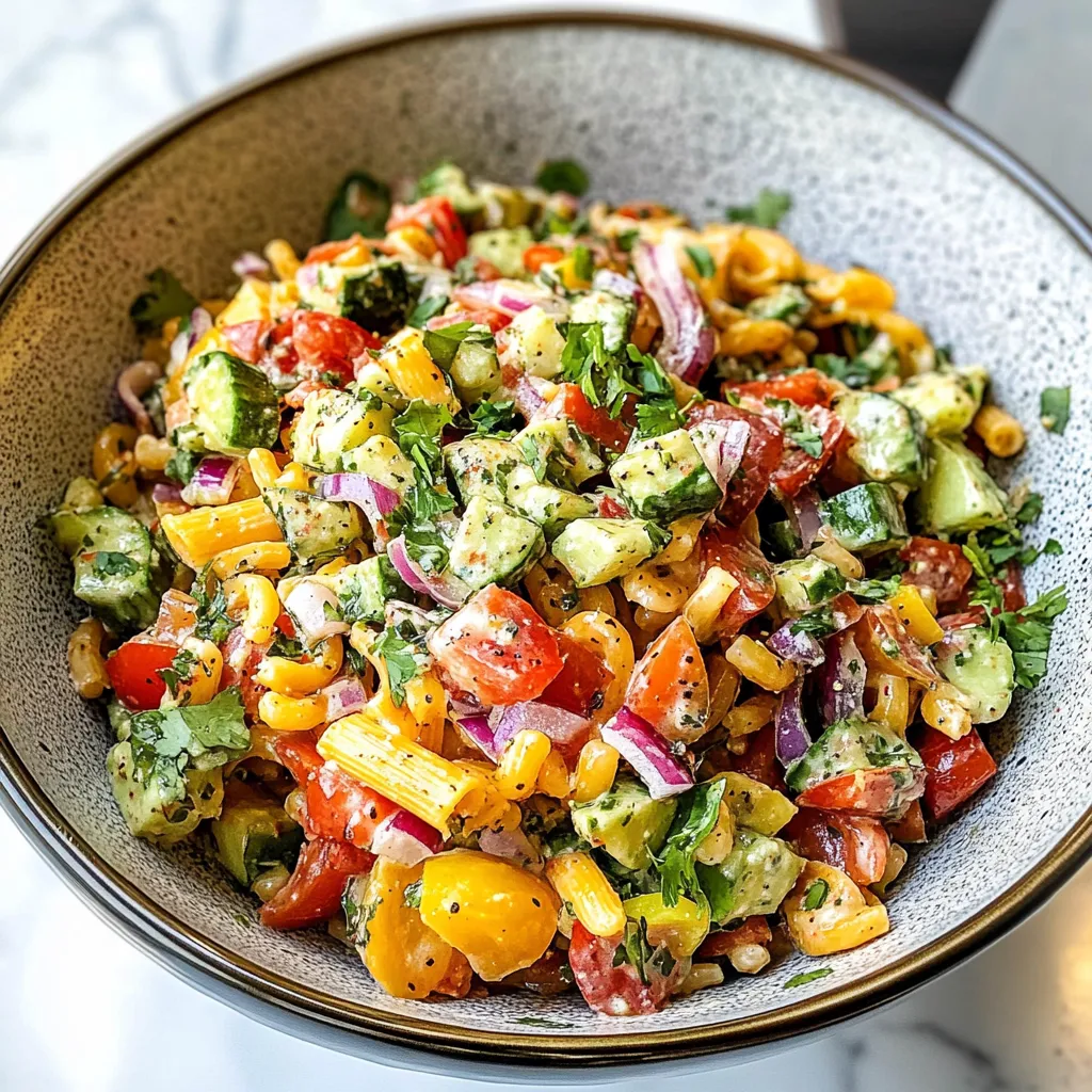 Dressing up your Mexican Pasta Salad Savory can turn an ordinary dish into something spectacular! Consider serving it in clear glass bowls or jars so guests can admire the colorful layers. Garnish with additional cilantro sprigs or lime wedges on top for an eye-catching effect. For added crunch and flair, sprinkle some crushed tortilla chips just before serving for texture contrast. Using vibrant tableware can enhance your overall presentation even more!